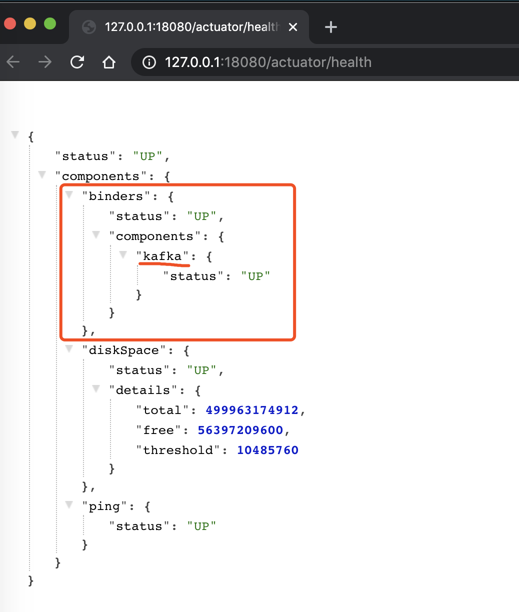 同时,Spring Cloud Stream Kafka 拓展了 Spring Boot Actuator 内置的 health 端点,通过自定义的 KafkaBinderHealthIndicator ,获取 Kafka 客户端的健康状态。