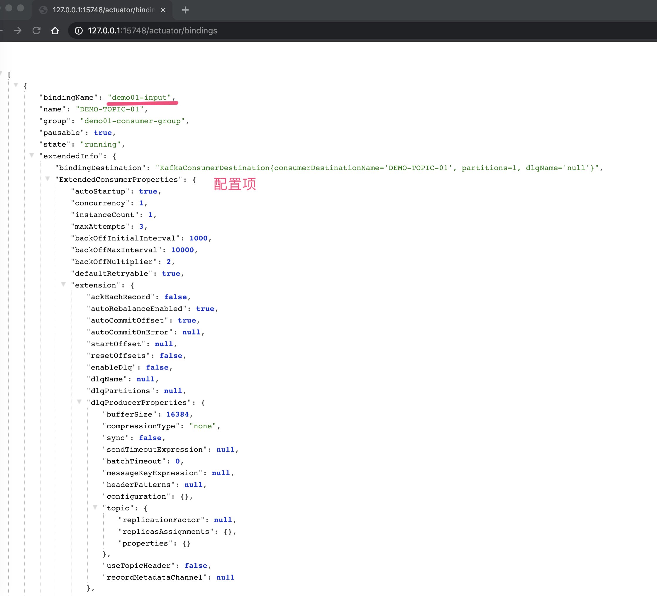 ② 访问应用的 bindings 监控端点 http://127.0.0.1:15748/actuator/bindings,返回结果如下图:
