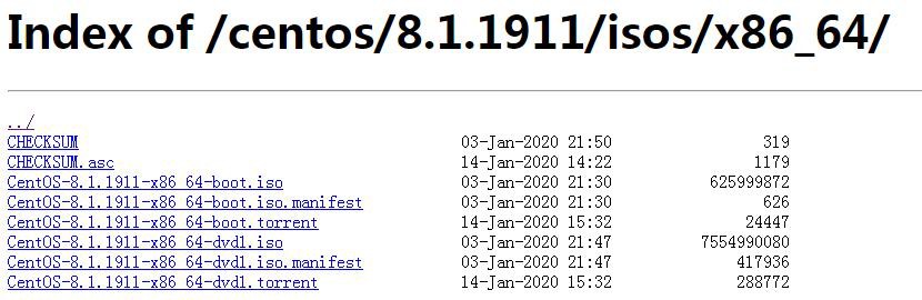 - CentOS-8.1.1911-x86_64-dvd1.iso CentOS 8.1 DVD 版 8G (未来的主流.) https://mirrors.aliyun.com/centos/8.1.1911/isos/x86_64/CentOS-8.1.1911-x86_64-dvd1.iso